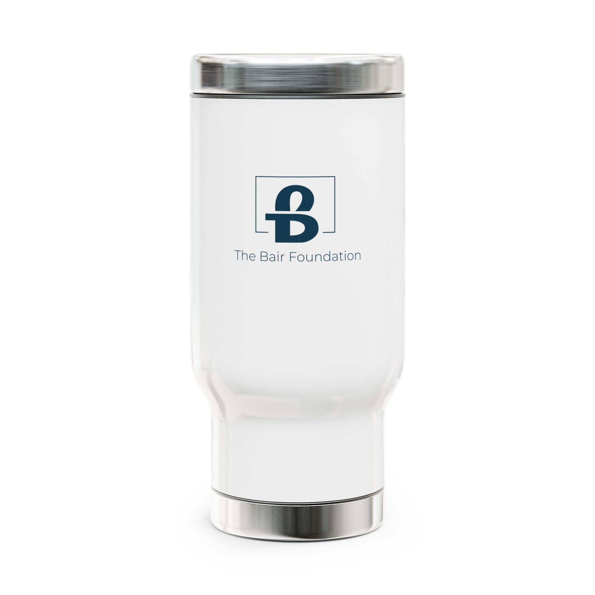 Take to the great outdoors with your favorite beverage in hand, all thanks to these custom stainless steel travel mugs. Each mug holds 14 oz. of your favorite beverage and is made with adventure-friendly stainless steel. With a glossy white enamel finish, a spill-resistant and snap-on cap, as well as a lined-in insulating plastic, this mug combines character with an explorer's favorite; practicality.